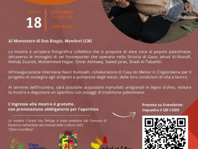Sabato 18 ottobre, alle ore 18.00 al Monastero di San Biagio di Mondovì, verrà inaugurata la mostra "I grant You Refuge", opera di sei fotoreporter palestinesi.