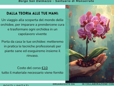 Giovedì 16 aprile, a partire dalle ore 20,30 presso i locali del Santuario di Monserrato di Borgo San Dalmazzo, il negozio "Elisir d'Orchidea" organizza un laboratorio floreale che vi porterà alla scoperta del mondo delle orchide