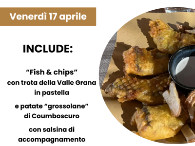 Venerdì 17 aprile, in serata presso il Bar Abrì di Pradleves, vi aspetta una gustosa cena a base di "Fish & Chips" con prodotti tipici della Valle Grana. Evento a pagamento, prenotazione obbligatoria.