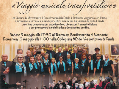 Sabato 9 maggio una passeggiata musicale transfrontaliera con Les Choeurs du Mercantour e il Coro Armonia della Parola di Vernante. Appuntamento alle 17.30 presso il Teatro ex Confraternita a Vernante. Ingresso libero e gratuito.