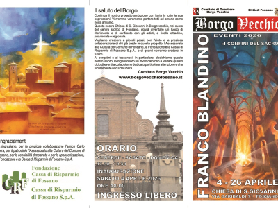 Dal 4 al 6 aprile presso l'ex chiesa di San giovanni, nel cuore del suggestivo Borgovecchio a Fossano, esposizione delle opere pittoriche di Franco Blandino. Orario: venerdì, sabato e domenica dalle ore 17.30 alle 19.30. Ingresso libero.
