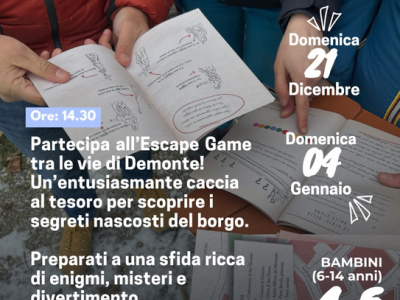 Domenica 21 dicembre e domenica 4 gennaio, a partire dalle ore 14,30 a Demonte (ritrovo presso la Biblioteca Civica), vi attende un'entusiasmante caccia al tesoro per scoprire i segreti nascosti del borgo.