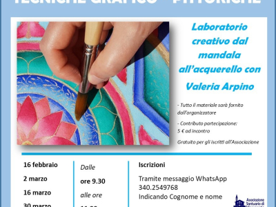 L’Associazione Santuario di Monserrato ODV propone un nuovo percorso dedicato all’espressione artistica e alla creatività: il Laboratorio creativo tecnico grafico di pittura “Dal mandala all’acquerello”, condotto da Valeria Arpino, nelle mattinate del 16 febbraio, 2, 16 e 30 marzo, con inizio all
