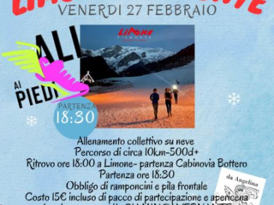 Venerdì 27 febbraio a Limone Piemonte torna l'amata corsa sulla neve con un percorso inedito di 9km e 500 metri di dislivello. Si partirà da Limone, dalla telecabina Bottero, per risalire le piste verso il Sole, bar le Buffe.