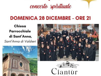 Domenica 28 dicembre, alle ore 21 presso la Chiesa Parrocchiale di Sant'Anna di Valdieri, si esibiranno in concerto i "Ciantùr d'Vudier" diretti dal maestro Fabio Pietro Di Tullio. Ingresso libero e gratuito.