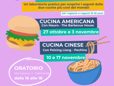 Lunedì 10 e 17 novembre, dalle ore 16,00 alle ore 18,00 presso l'oratorio di Demonte, l'associazione "Palestr3 Giovani" organizza due laboratori di cucina cinese con Peixing Lang del Ristorante Pechino.