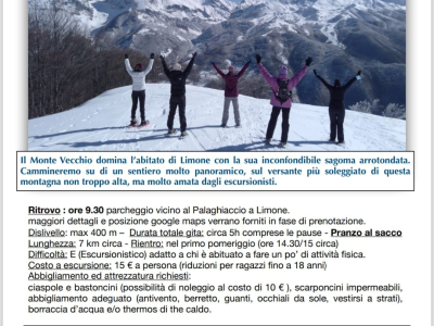 Domenica 1° marzo la guida escursionistica locale Monica Dalmasso organizza una ciaspolata panoramica ai piedi del Monte Vecchio, la cima dalla sagoma arrotondata che domina l'abitato di Limone Piemonte. L'appuntamento è fissato per le ore 9.30 p