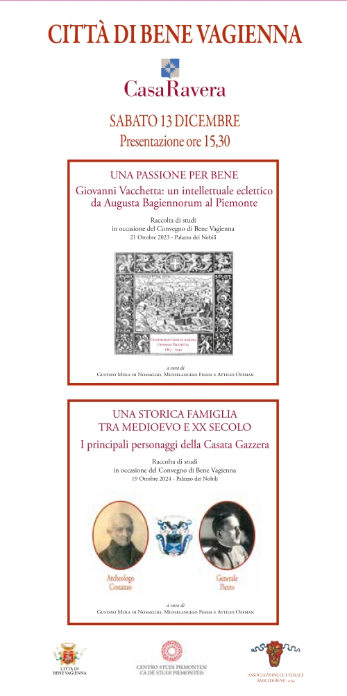 Sabato 13 dicembre alle ore 15.30 presso Casa Ravera a Bene Vagienna, presentazione delle pubblicazioni "Giovanni Vacchetta: una passione per Bene, un intellettuale eclettico da Augusta Bagiennorum al Piemonte" e "Una storica Famiglia tra medioevo e XX secolo, i principali personaggi della casata Gazzera", raccolta di studi relativi ai convegni tenutisi a Bene Vagienna il 21 ottobre 2023 e il 19 ottobre 2024. Ingresso libero.