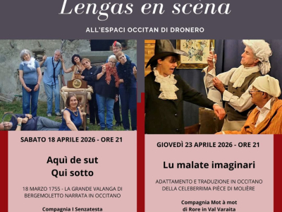 Sabato 18 aprile e giovedì 23 aprile, alle ore 21,00 presso la sede di Espaci-Occitan a Dronero (Via Val Maira, 19), vi aspettano due appuntamenti teatrali in lingua occitana: "Aquì de sut" della compagnia "I Senzatesta" e "Lu malate Imag
