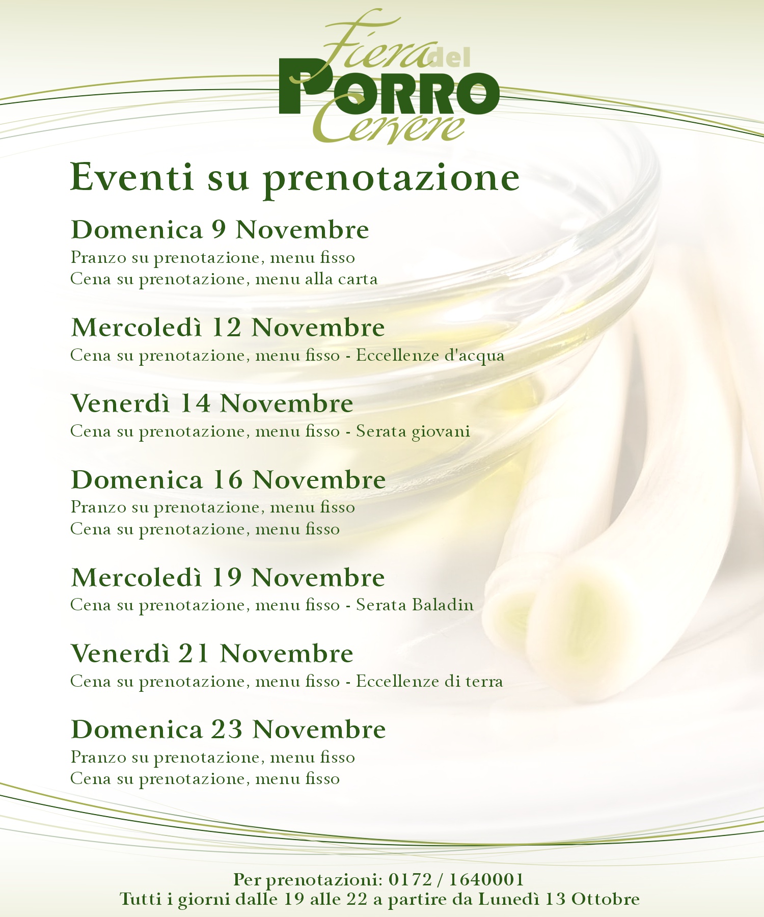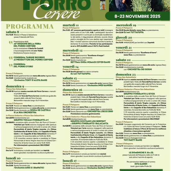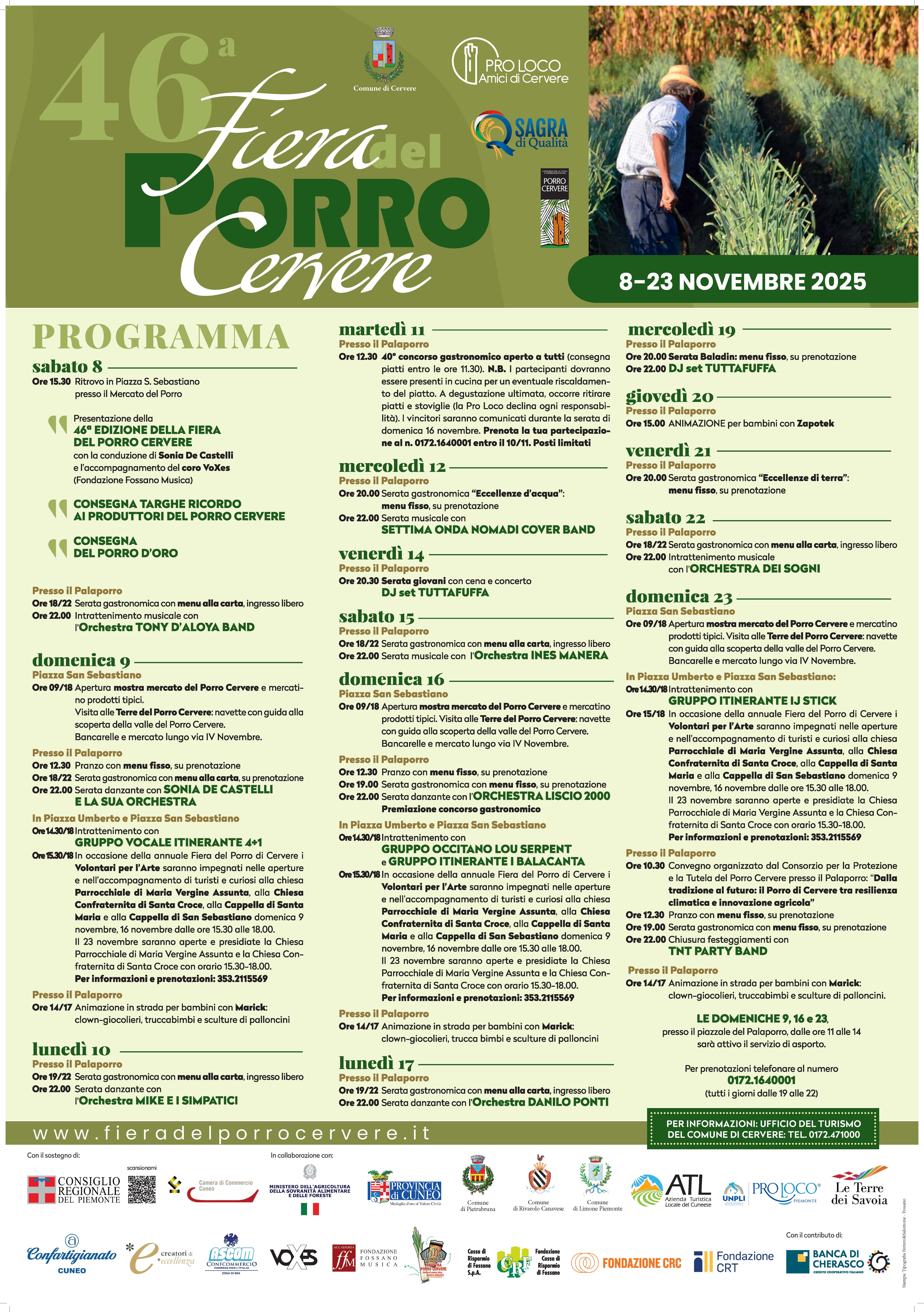 Da sabato 8 a domenica 23 novembre ritorna uno degli eventi enogastronomici più importanti e conosciuti del Piemonte con la 46^ edizione della "Fiera del Porro di Cervere", rinomata vetrina delle eccellenze del territorio e non solo. In locandina le date degli appuntamenti enogastronomici con prenotazione obbligatoria al 0172 1640001 dalle ore 19 alle 22. Per conoscere i menù: clicca qui.
