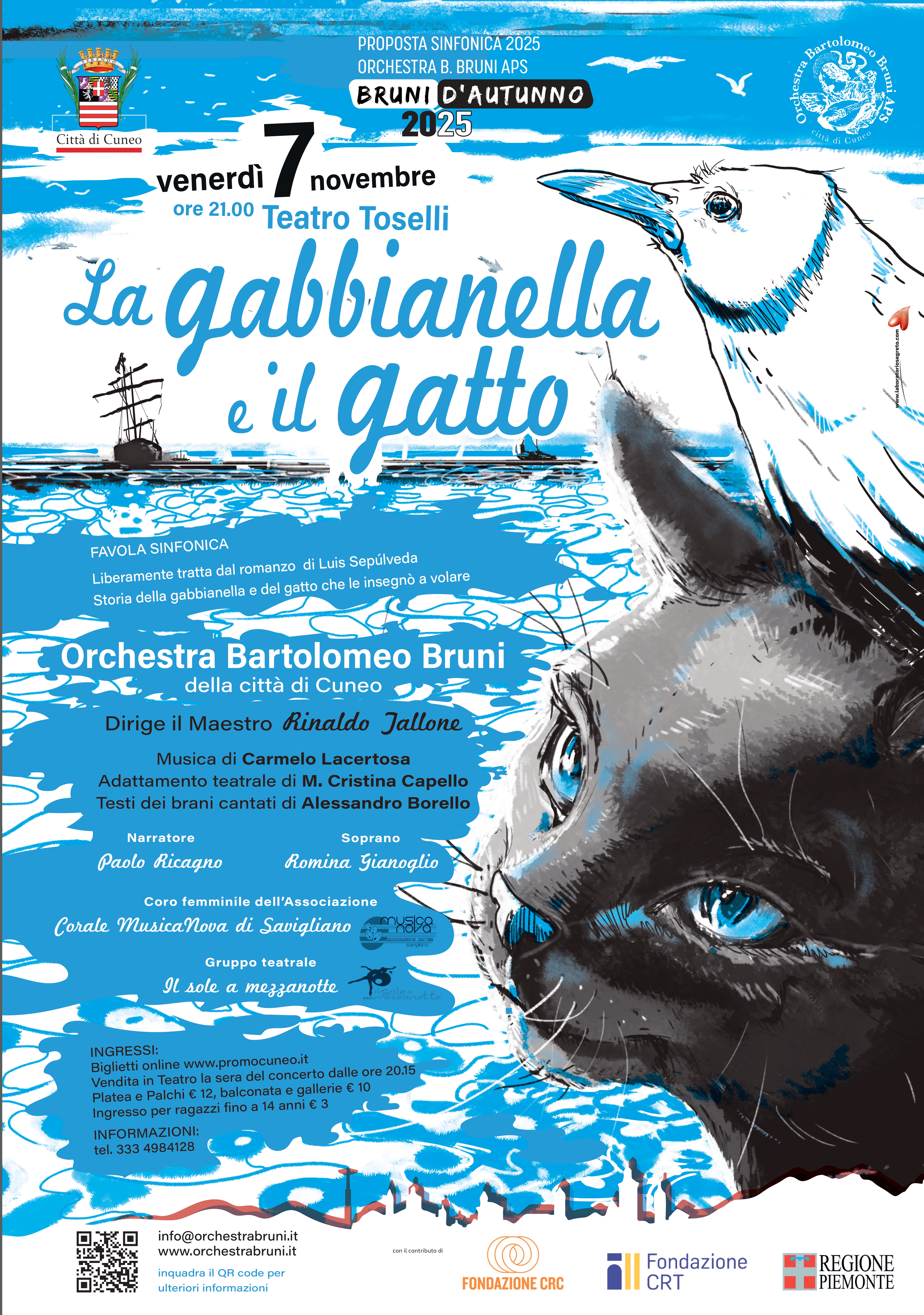 Venerdì 7 novembre, alle ore 21, il civico Teatro Toselli di Cuneo ospiterà la favola sinfonica “La Gabbianella e il Gatto” portata in scena dall'orchestra Bartolomeo Bruni . Lo spettacolo, liberamente tratto dal romanzo di Luis Sepùlveda, conserva la grazia della fiaba e insieme la forza allegorica di un racconto che crede ostinatamente nella capacità di riscatto dell’umanità. Biglietti in vendita qui.