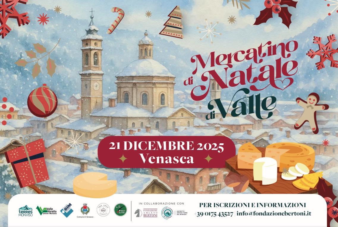 NATALE CAPODANNO ED EPIFANIA Periodo: 21/12/2025 Località: Venasca Domenica 21 dicembre Venasca ospita un imperdibile Mercatino di Natale. Per tutta la giornata artigianato e animazione per tutti! Informazioni +39 0175 435 27info@fondazionebertoni.it
