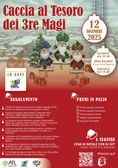 Venerdì 12 dicembre a Cuneo si terrà la Caccia al Tesoro dei 3Re Magi, con ritrovo alle 18.30 presso l’Open Baladin in Piazza Foro Boario e partenza alle 19.00. Preparati a vivere un’avventura magica tra enigmi, indizi e tanto divertimento nel cuore della città di Cuneo. Partecipa anche tu, clicca qui.