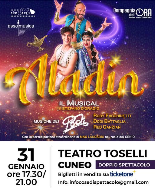 Domenica 31 gennaio, doppio spettacolo, alle ore 17.30 e alle ore 21, il civico Teatro Toselli di Cuneo ospiterà il musical di Aladin-Il musical portato in scena dalla compagnia dell’ORA, scritto da Stefano D’Orazio con le musiche dei Pooh, Roby Facchinetti, Dodi Battaglia e Red Canzian. Lo spettacolo, liberamente tratto dall'omonimo film d'animazione, ne conserva la magia e l'incanto.
