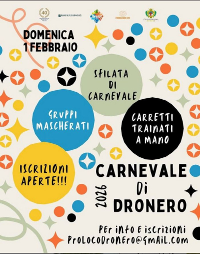 Domenica 1° febbraio la città di Dronero festeggia il Carnevale. Le iscrizioni per carri trainati a mano e gruppi mascherati sono ufficialmente aperte. Hai un’idea folle? Un costume improbabile? È il tuo momento! Il programma della giornata di festa è in fase di definizione.