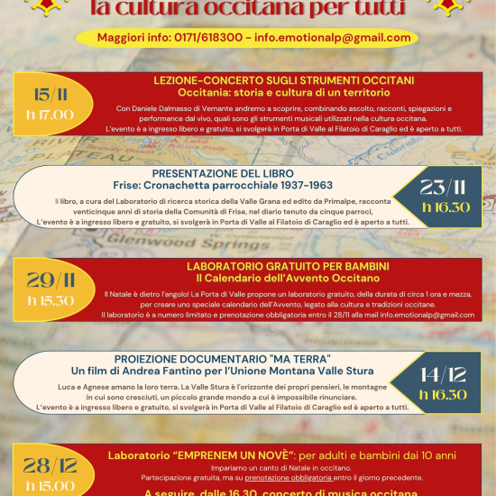 Ritorna la rassegna “Trobar Leu – La Cultura Occitana per tutti” organizzata dalla Cooperativa EmotionAlp in Porta di Valle della Valle Grana. Gli appuntamenti della rassegna saranno distribuiti tra novembre (dal 15) e dicembre, cinque in totale, tra lezioni, concerto, presentazioni, proiezioni e laboratori.