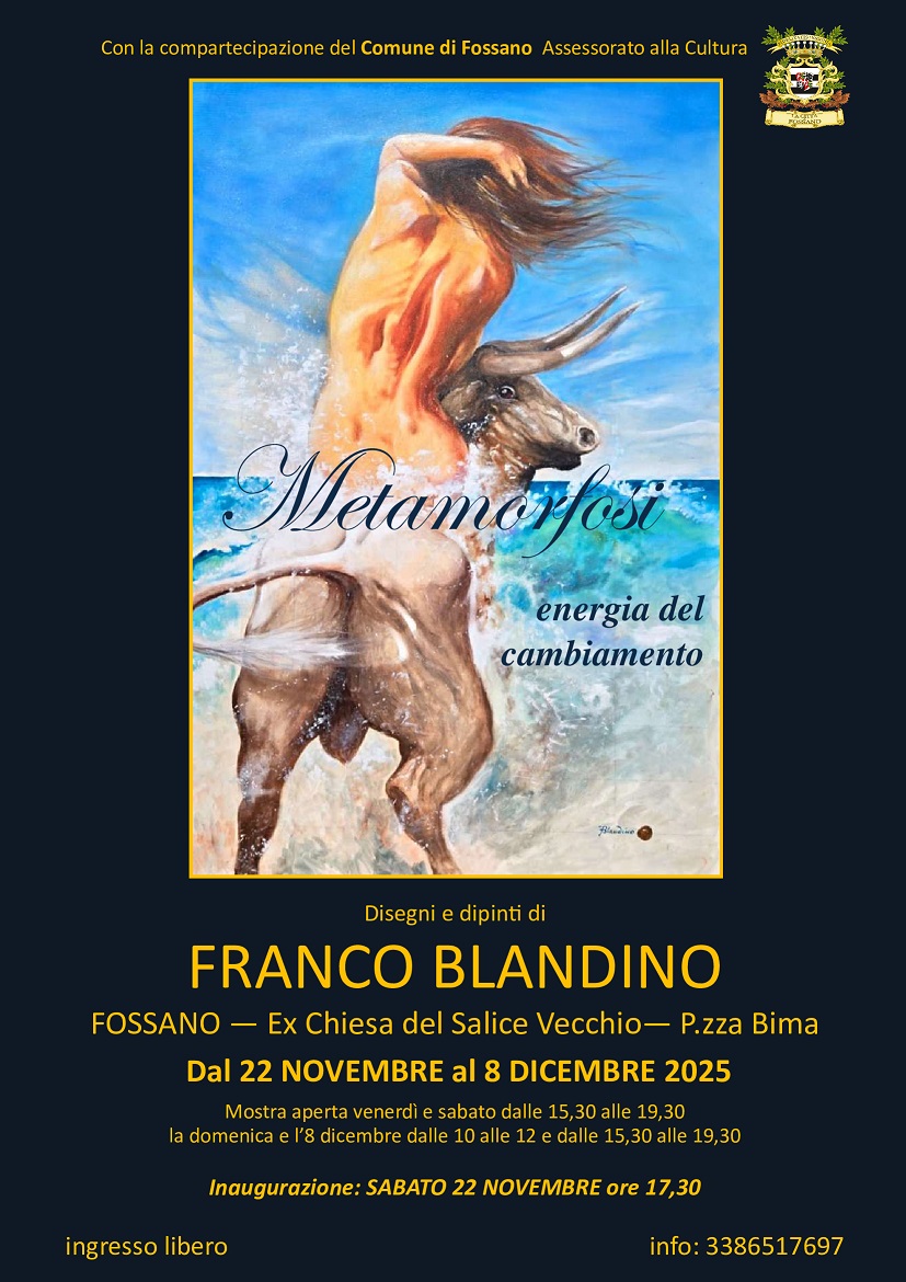 Da sabato 22 novembre a lunedì 8 dicembre la suggestiva ex chiesa del Salice Vecchio a Fossano ospita la mostra del pittore Franco Blandino: "Le Metamorfosi nell'arte - L'energia del cambiamento, da Ovidio al Vangelo di Luca". Orario: venerdì e sabato dalle 15.30 alle 19.30; domenica e l’8 dicembre dalle 10 alle 12 e dalle 15.30 alle 19.30, ingresso libero.