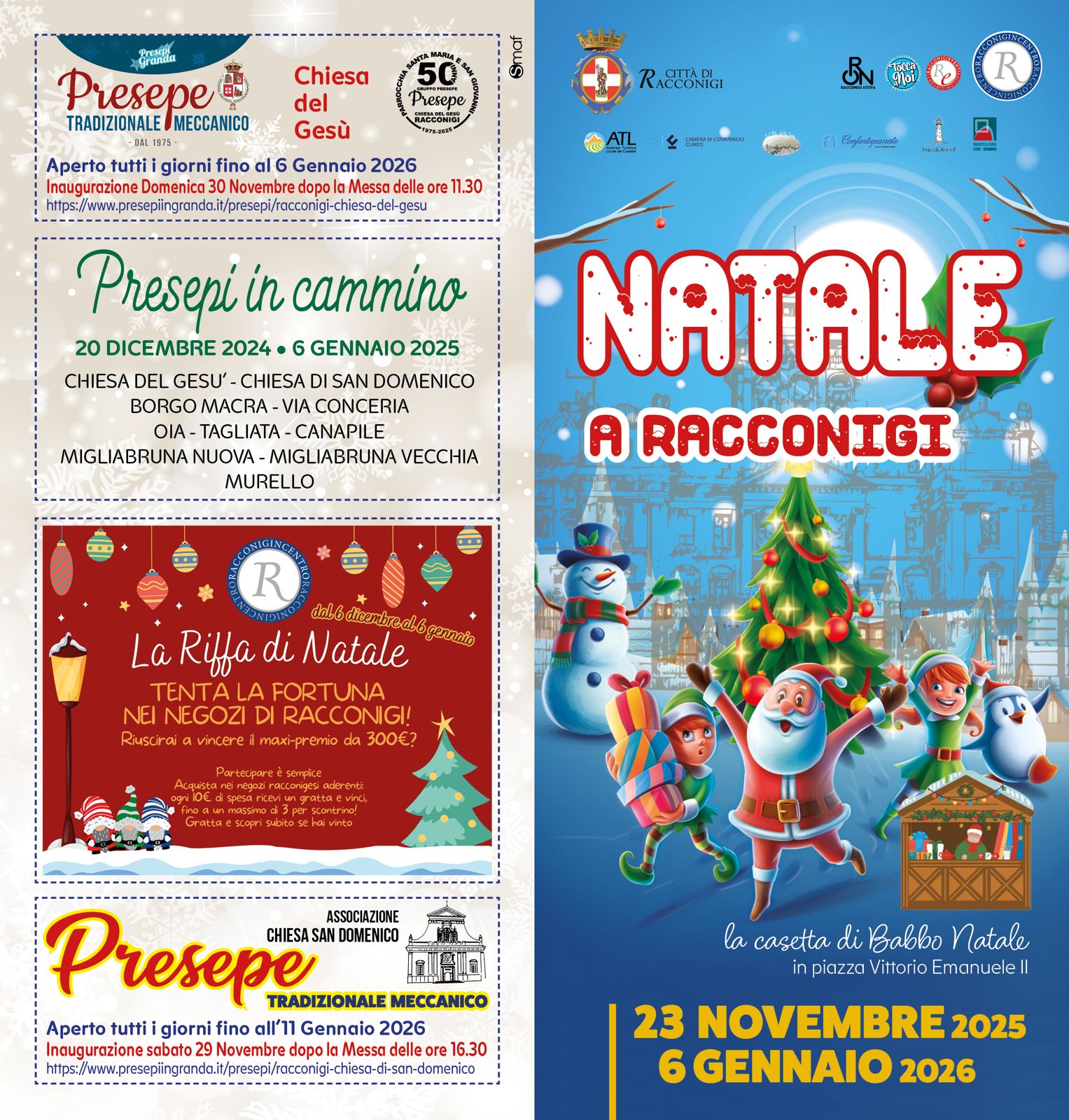 Dal 23 novembre al 4 gennaio Racconigi festeggia il periodo natalizio con tantissimi eventi dedicati, musica, mercatini, visite guidate, enogastronomia e tanto divertimento per grandi e piccini. Scopri il programma completo nella locandina in basso.