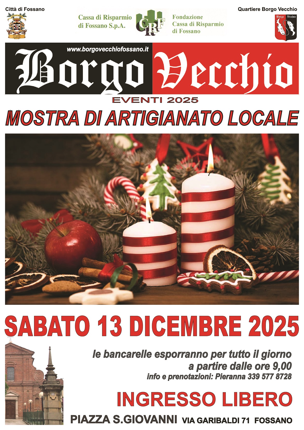 A Fossano sabato 13 dicembre dalle ore 9.00 alle 18.00 in piazzetta San Giovanni, nel cuore del suggestivo Borgo Vecchio, Mostra di artigianato locale con più di trenta espositori e tantissime idee regalo natalizie.