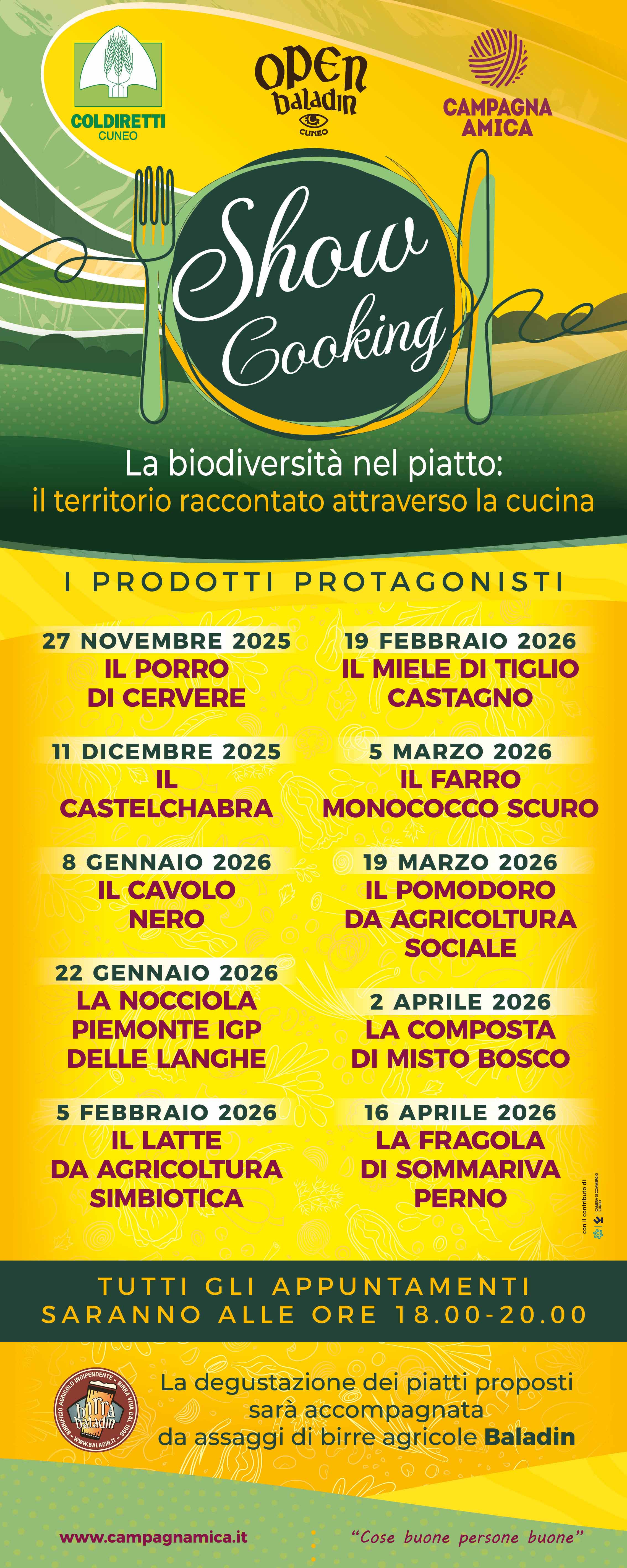 Nuova stagione di show cooking all’Open Baladin Cuneo con Coldiretti Campagna Amica. L'8 gennaio appuntamento con il cavolo nero, mentre il 22 gennaio con la nocciola Piemonte IGP delle Langhe. Il palinsesto propone anche quest’anno dieci appuntamenti, sempre di giovedì dalle 18 alle 20. Gli eventi sono gratuiti, con prenotazione obbligatoria.