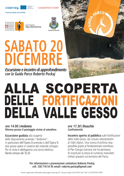 Sabato 20 dicembre, dalle ore 14,00 alle ore 16,00 in località "Cià Lombard" (Comune di Valdieri), vi attende una visita guidata a due fortificazioni situate tra Andonno e Valdieri. A seguire alle ore 17,30, trasferimento a Roaschia presso la "Crusà" e presentazione delle fortificazioni alpine in Valle Gesso a cura della Guida Parco Roberto Pockaj. Evento gratuito, prenotazione obbligatoria.