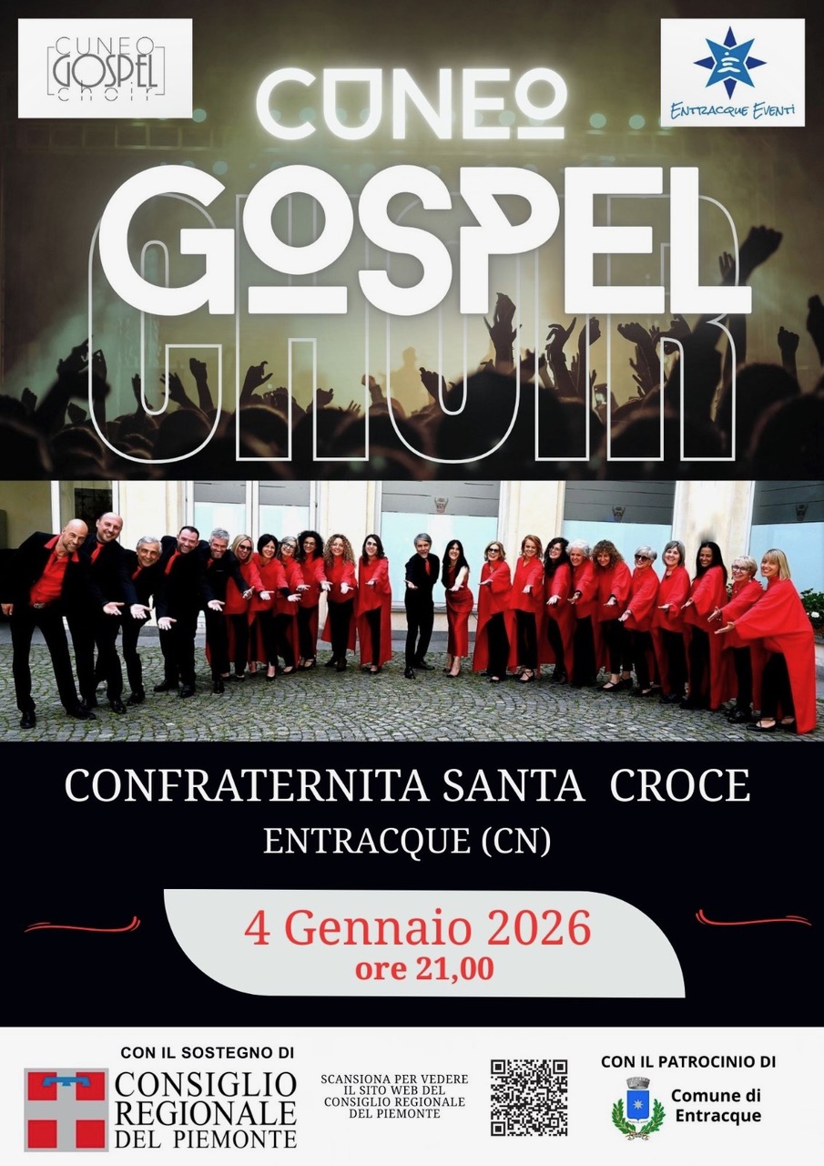 Il 4 gennaio, dalle ore 21, la Confraternita di Santa Croce ad Entracque ospita il Cuneo Gospel Choir in concerto, una musica che racconta il dolore, le difficoltà e le frustrazioni della vita quotidiana, ma anche la fede e la speranza di liberazione e di riscatto. Ingresso libero.