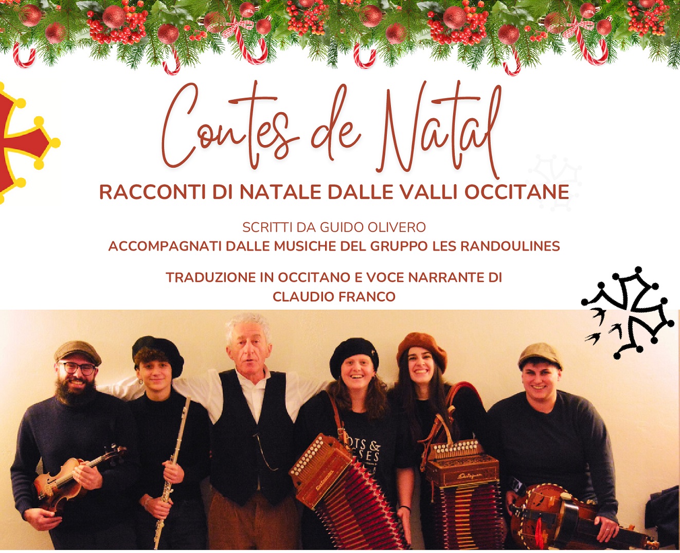 Domenica 21 dicembre alle ore 17.00 presso il Centro Culturale Lou Pourtoun di Ostana: "CONTES DE NATAL - Racconti di Natale dalle valli occitane". Scritti da Guido Olivero, tradotti in occitano e interpretati da Claudio Franco ed accompagnati dalle musiche del gruppo Les Randoulines. Ingresso libero e gratuito.