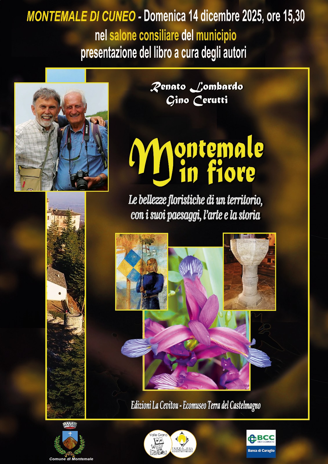 Domenica 14 dicembre, alle ore 15,30 presso il salone consiliare del municipio di Montemale, appuntamento con la presentazione del libro "Montemale in fiore" a cura degli autori Renato Lombardo e Gino Cerutti. Ingresso libero fino ad esaurimento posti, prenotazione consigliata.