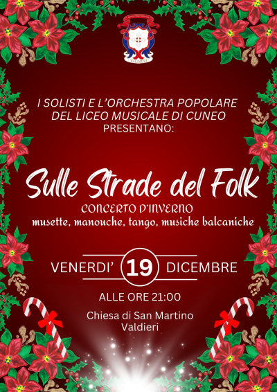 Venerdì 19 dicembre, alle ore 21,00 presso la chiesa parrocchiale di San Martino a Valdieri, i solisti e l'orchestra popolare del Liceo Musicale di Cuneo si esibiranno nello spettacolo musicale "Sulle strade del Folk". Un viaggio tra musette, manouche, tango e musiche balcaniche vi attende! Evento libero e gratuito.
