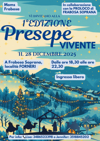 Domenica 28 dicembre a Frabosa Soprana, in località Forneri, si terrà la prima edizione del Presepe vivente, dalle 18.30 alle 22.30, organizzato dal gruppo MOMS di Frabosa in collaborazione con la Pro Loco. Ingresso libero.
