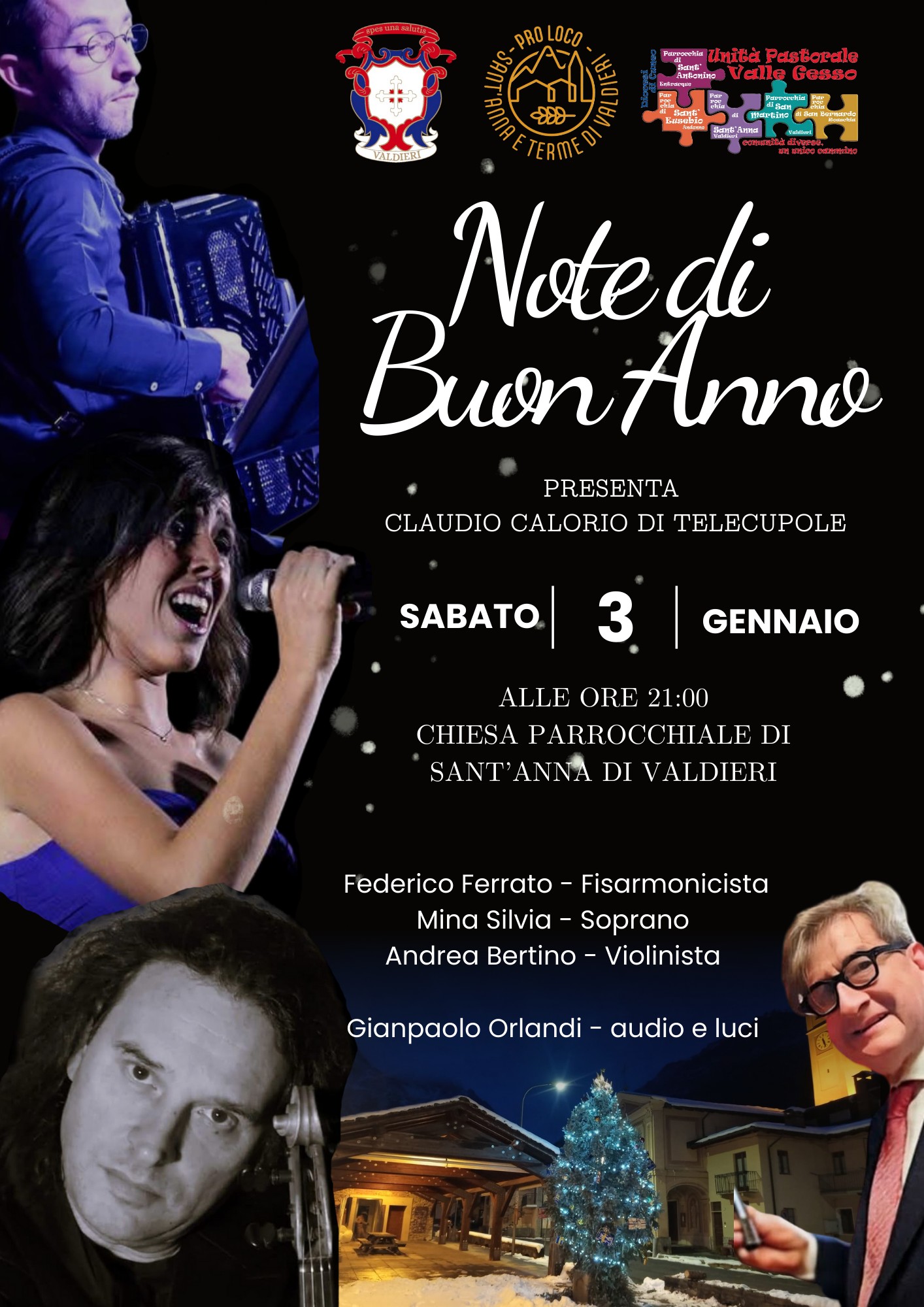 Sabato 3 gennaio, alle ore 21,00 presso la chiesa parrocchiale di Sant'Anna di Valdieri, Claudio Calorio di Telecupole presenta il concerto "Note di Buon Anno". Vi aspettiamo numerosi! Evento libero e gratuito.