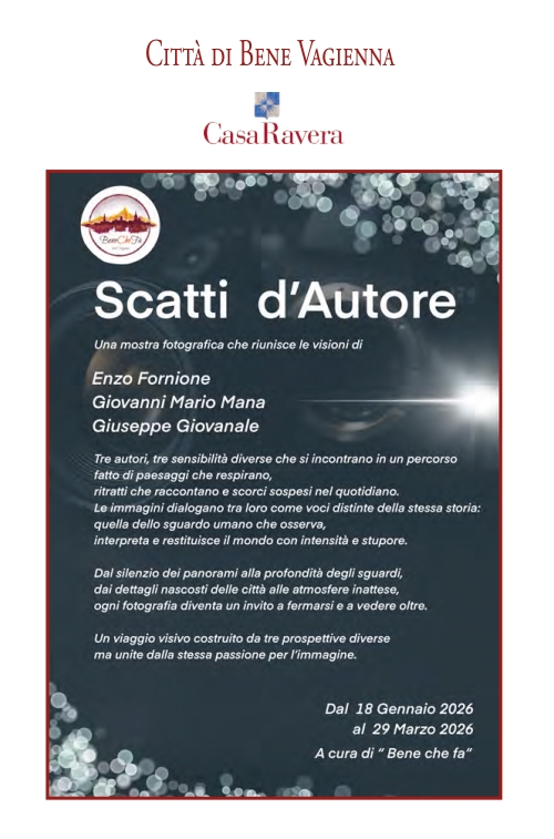 Da domenica 18 gennaio a domenica 29 marzo, Casa Ravera a Bene Vagienna ospita la rassegna fotografica "Scatti d’autore" di Enzo Fornione, Giovanni Mario Mana e Giuseppe Giovenale, a cura di Bene che fa. L’inaugurazione si terrà il 18 gennaio alle ore 10.30. La mostra è aperta nei giorni festivi dalle 10.00 alle 12.00 e dalle 15.00 alle 18.00. Ingresso libero.
