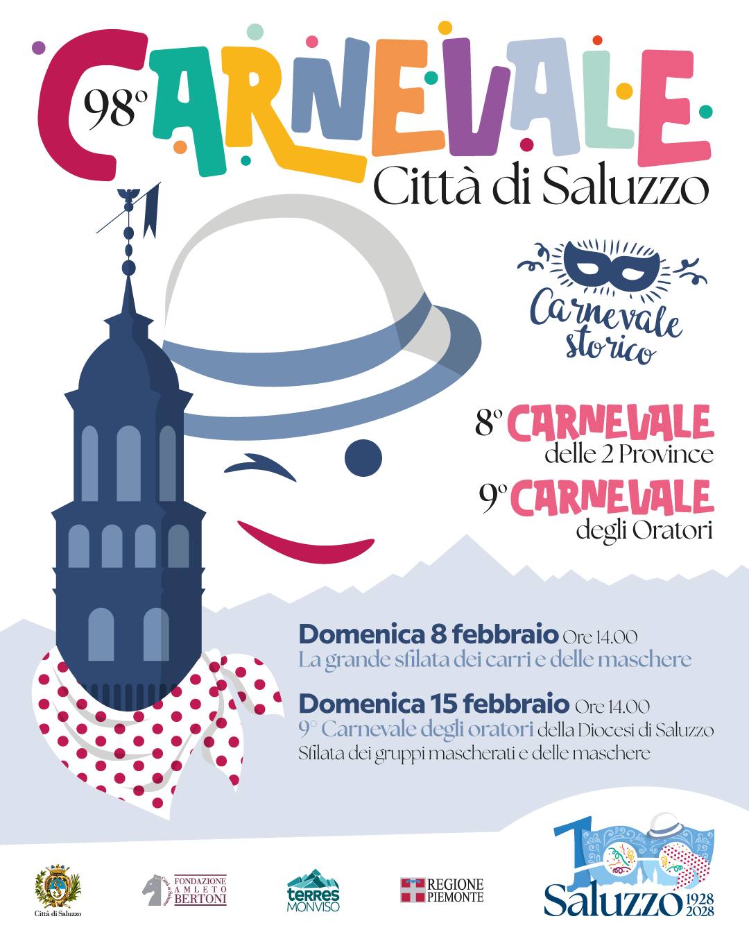 Da domenica 8 febbraio prendono il via il 98° Carnevale di Saluzzo, il 9° Carnevale degli Oratori della Diocesi di Saluzzo e l'8° Carnevale delle 2 Province. Programma disponibile sul sito e di seguito.