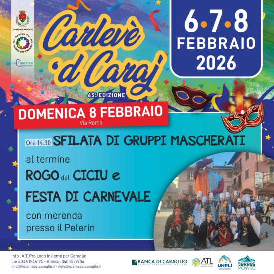 Appuntamento aperto a tutti e tutte a Caraglio, dal 6 all'8 febbraio per festeggiare il Carnevale con tutta la comunità. Tre giorni di divertimento, tra serate in musica, la sfilata dei gruppi mascherati e la tradizionale cena con la consegna delle chiavi della città a Cecilia e Roldano. Programma completo di seguito e nelle locandine allegate.