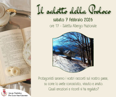 Sabato 7 febbraio alle ore 17:00, presso la saletta dell'Albergo Nazionale, la Pro Loco San Giacomo organizza "Il salotto della Pro Loco". L'ingresso è libero e gratuito.