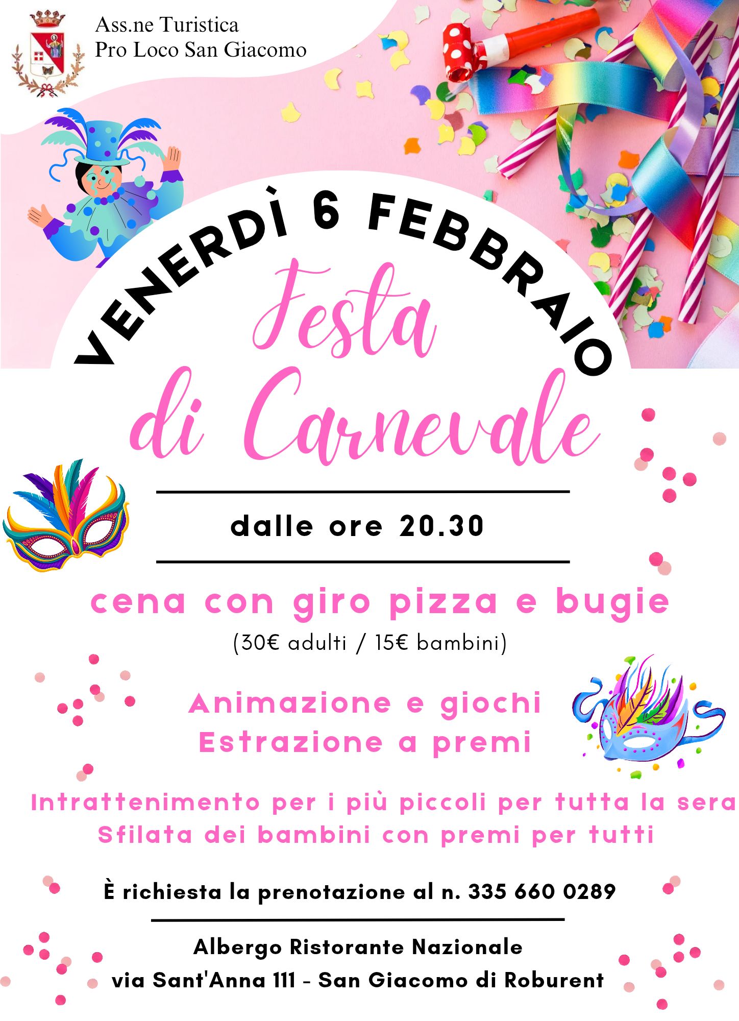 Venerdì 6 Febbraio dalle ore 20:30, presso l'Albergo Ristorante Nazionale, la Pro Loco San Giacomo organizza una "Festa di Carnevale". Ci saranno giro pizza, bugie e poi animazione, giochi e una estrazione a premi. I più piccoli, che giocheranno insieme ad un'animatrice, verranno preparati per la sfilata in costume. La prenotazione è obbligatoria per telefono e la quota di partecipazione è 30 euro per gli adulti e 15 euro per i bambini.