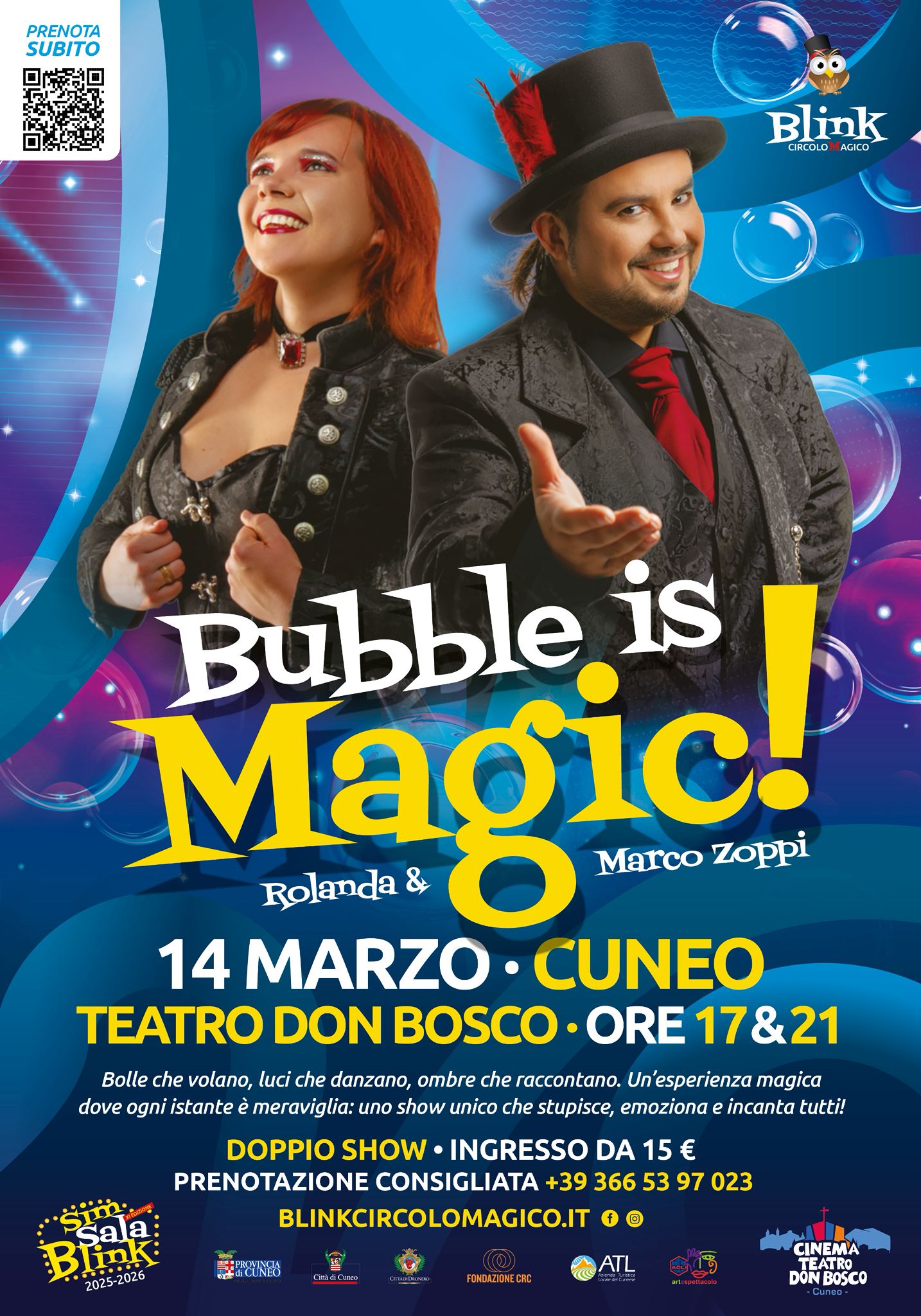 Sabato 14 marzo, al Teatro Don Bosco di Cuneo, è in programma “Bubble is Magic” di Rolanda e Marco Zoppi, uno show magico e suggestivo in cui bolle di sapone, luci danzanti e giochi d’ombra creano un’esperienza visiva capace di stupire, emozionare e incantare il pubblico di tutte le età. Lo spettacolo andrà in scena in doppia replica, alle ore 17.00 e alle ore 21.00. Prenotazione consigliata su Eventbrite.