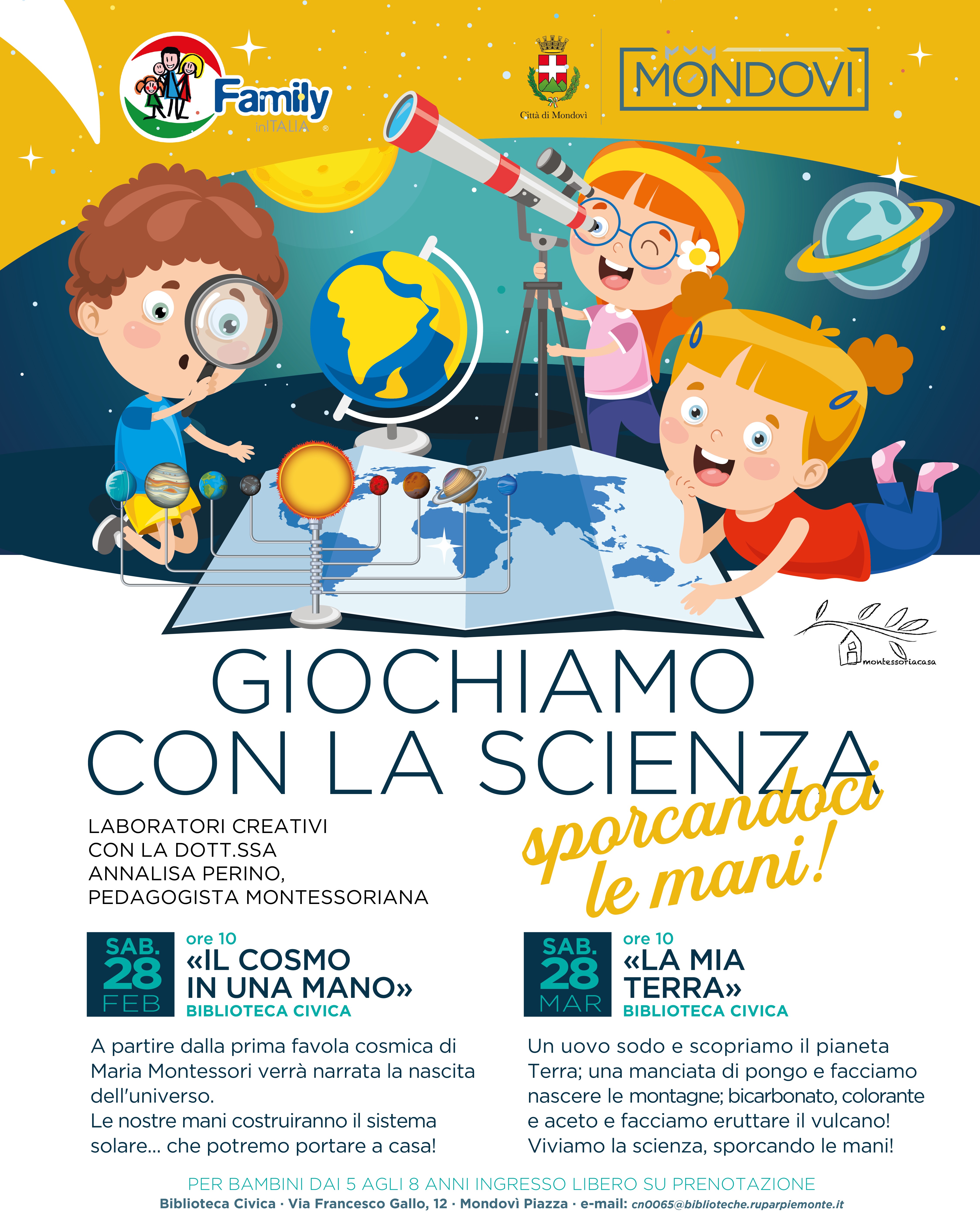 La biblioteca di Mondovì ospita due eventi dedicati a bambine e bambini dai 5 agli 8 anni dal titolo "Giochiamo con la scienza". Si tratta di laboratori creatici con la Dottoressa Annalisa Perno. Sabato 28 febbraio alle ore 10 "Il Cosmo in una mano", partendo dalla prima favola cosmica montessoriana verrà costruito un sistema solare. Ingresso libero su prenotazione.