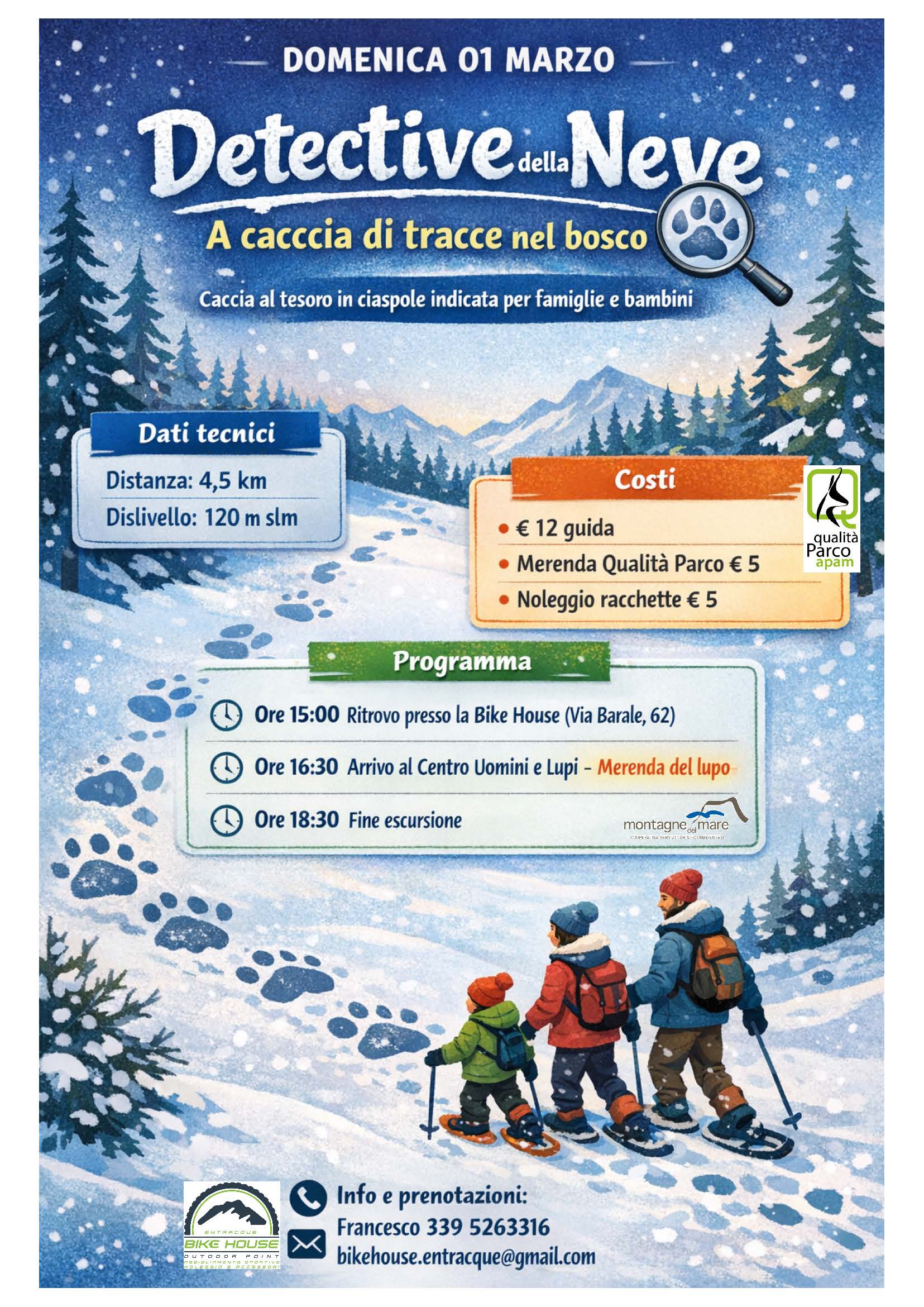 Domenica 1 marzo, a partire dalle ore 15,00 ad Entracque, vi attende una fantastica caccia al tesoro in ciaspole per bambini e famiglie. Evento a pagamento, prenotazione necessaria.