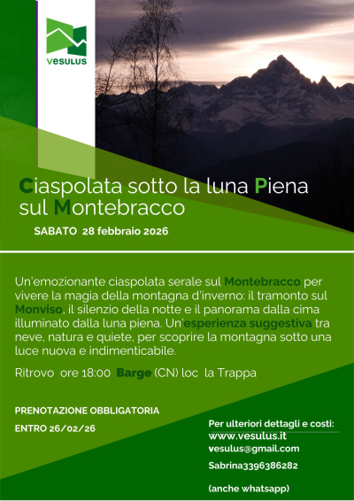 Il 28 febbraio, le guide escursionistiche di Vesulus organizzano una ciaspolata, adatta a tutti, sotto la luna piena sul Mombracco, con tramonto sul Monviso e la magia della notte in montagna. L'itinerario prevede la partenza da Pian della Regina, Pian del Re, lago Fiorenza, Chiaretto, lago Superiore e ritorno. Ritrovo a Barge alle 17.30, rientro dopo le 22. Prenotazione obbligatoria.