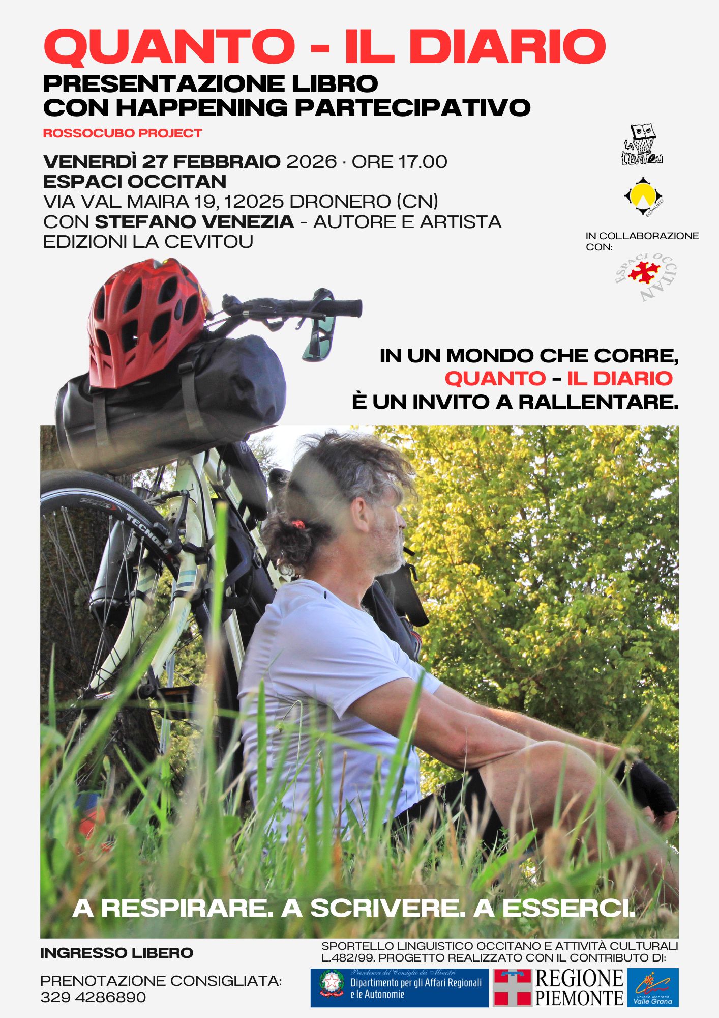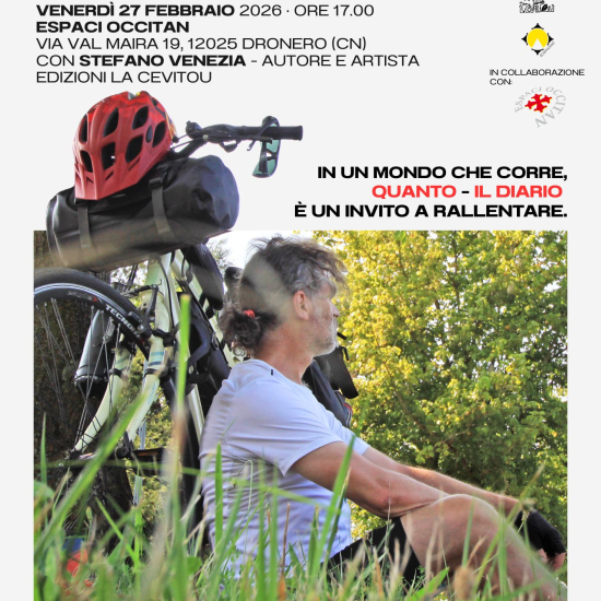 Venerdì 27 febbraio, alle ore 17.00, presso la Biblioteca dell'Associazione Espaci Occitan di Dronero, l'Ecomuseo Terra del Castelmagno organizza la presentazione del libro "Quanto - il diario" di Stefano Venezia. Ingresso libero e prenotazione consigliata.