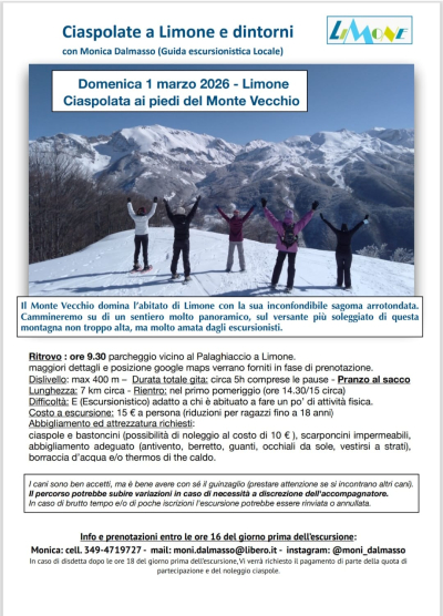 Domenica 1° marzo la guida escursionistica locale Monica Dalmasso organizza una ciaspolata panoramica ai piedi del Monte Vecchio, la cima dalla sagoma arrotondata che domina l'abitato di Limone Piemonte. L'appuntamento è fissato per le ore 9.30 presso il parcheggio adiacente al Palaghiaccio di Limone. Prenotazione obbligatoria.