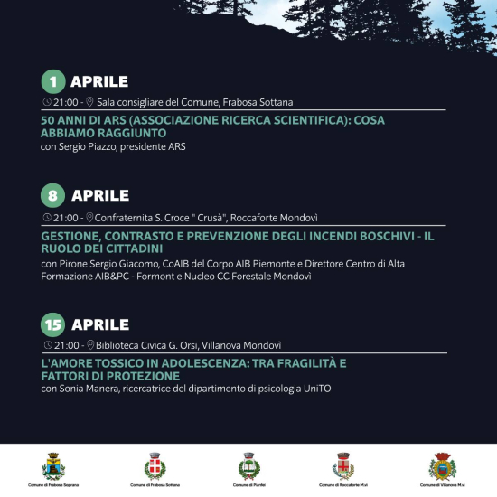 L'Unione Montana Mondolé ha presentato il calendario degli appuntamenti serali del progetto "Università del Mondolé 2026". Da marzo a maggio, ogni mercoledì alle 21.00, la cultura accende le serate di Frabosa Soprana, Frabosa Sottana, Pianfei, Roccaforte Mondovì e Villanova Mondovì. Salute, intelligenza artificiale, sport, ambiente, relazioni, tradizioni locali e grandi avventure tra le vette del Marguareis e dell’Everest: appuntamenti da non perdere!