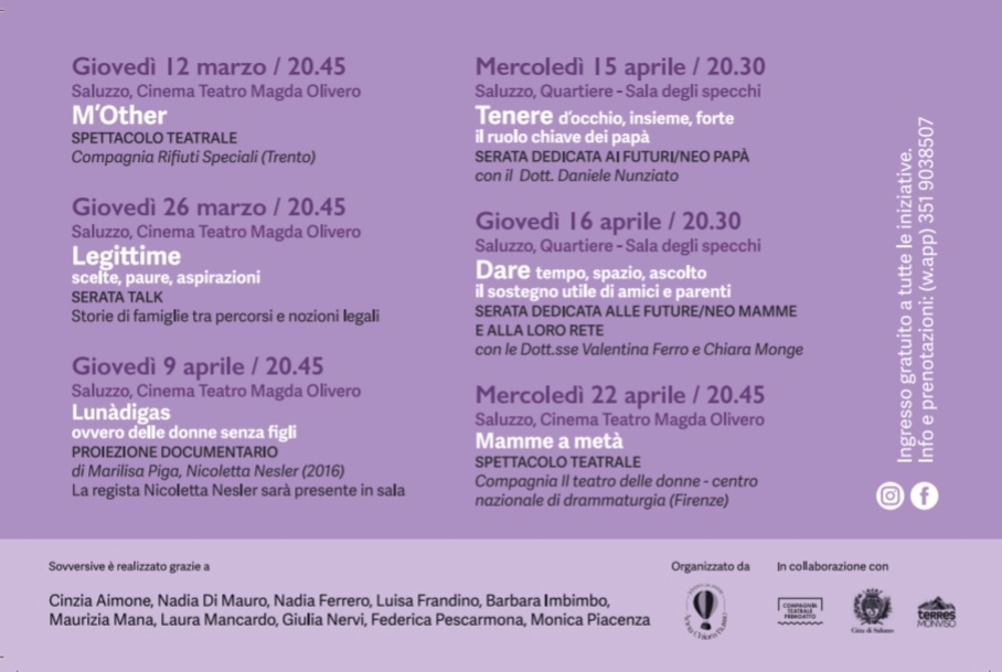 Giovedì 9 aprile alle ore 20.45 a Saluzzo, presso il Cinema Teatro Magda Olivero (via Palazzo di Città, 15), verrà proiettato "Lunàdigas, ovvero delle donne senza figli", documentario di Marisa Piga e Nicoletta Nesler (2016). La regista Nicoletta Nesler sarà presente in sala. La serata fa parte della rassegna "Sovversive", quest'anno dedicata alla genitorialità come scelta consapevole. Evento gratuito, prenotazioni tramite il sito Eventbrite.