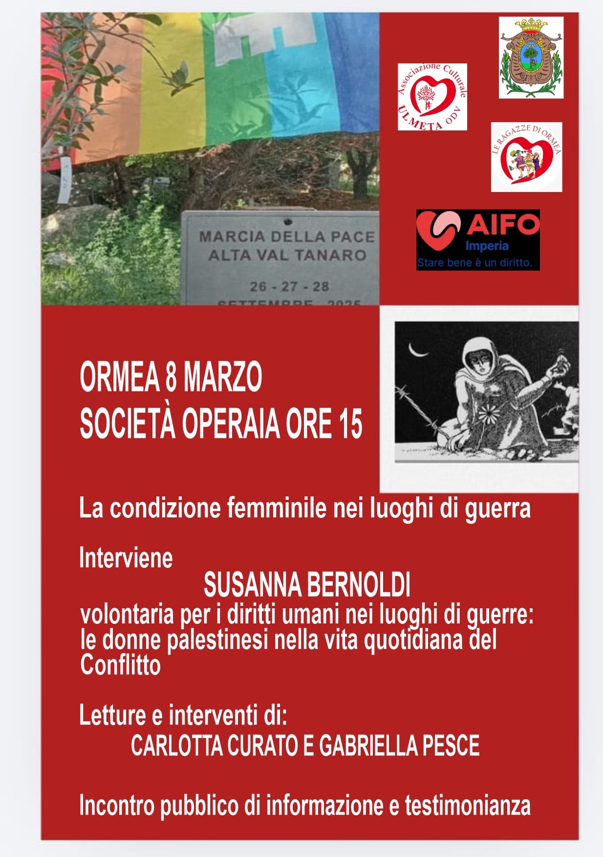 A Ormea nella Sala della Croce Bianca alle ore 15.00 interviene Susanna Bernoldi, volontaria per i diritti umani nei luoghi di guerre: le donne palestinesi nella vita quotidiana del Conflitto.