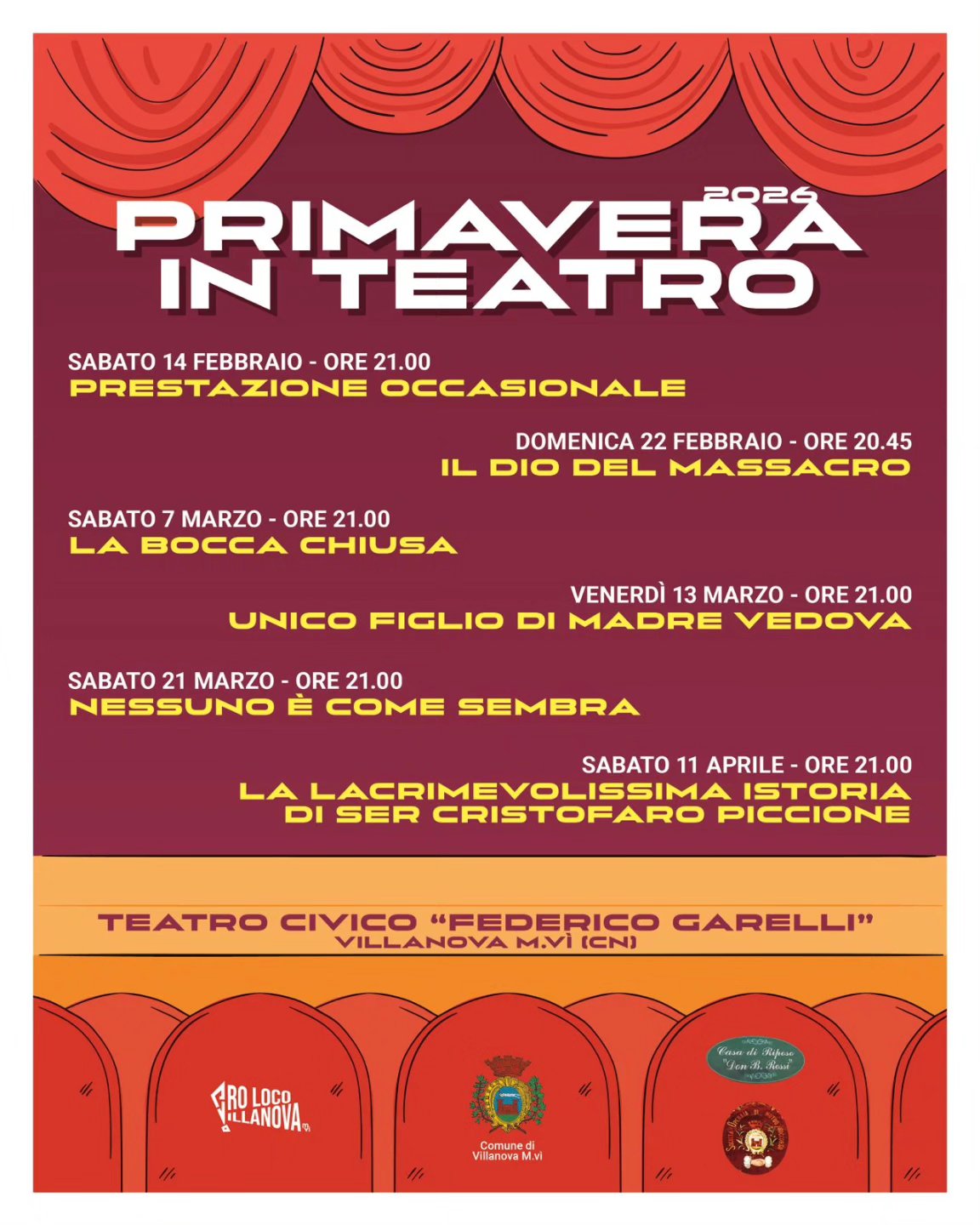 Sabato 21 marzo alle ore 21.00 a Villanova Mondovì vi aspetta lo spettacolo teatrale "Nessuno è come sembra", presso il teatro civico "Federico Garelli". L'evento fa parte della rassegna "Primavera in teatro", nella locandina il programma completo.