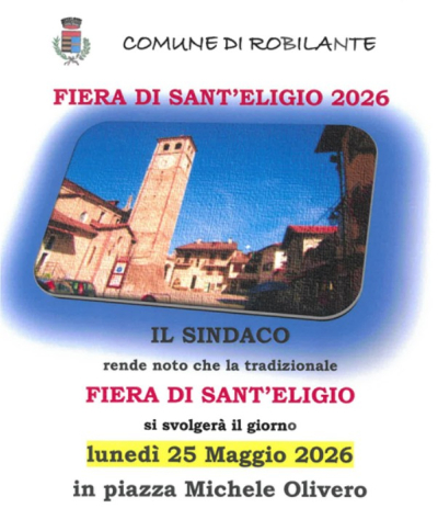 Il Comune di Robilante organizza, il 25 maggio, la tradizionale fiera di Sant'Eligio in piazza Michele Olivero. Per tutta la giornata saranno presenti banchi di prodotti alimentari e non. Ingresso libero. Gli operatori economici che volessero prendere parte alla manifestazione possono fare domanda cliccando qui.