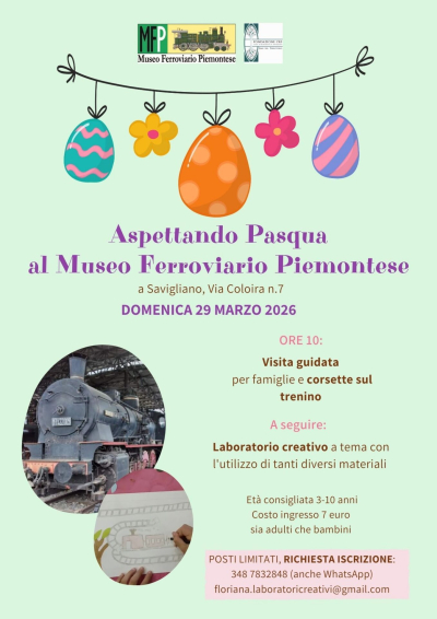 Domenica 29 marzo, alle ore 10.00, il Museo Ferroviario Piemontese di Savigliano organizza una speciale mattinata in attesa di Pasqua con visita guidata, corsetta sul trenino e a seguire un laboratorio creativo a tema per i più piccini. Il costo è di 7 euro (età consigliata 3-10 anni), necessaria la prenotazione.