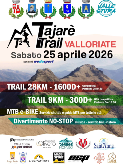 Sabato 25 aprile vi aspetta il Tajarè Trail di Valloriate: due percorsi di diversa lunghezza e dislivello (28 km da 1650 m D+, 9 km da 300 D+), con musica e servizio bar tutto il giorno, oltre a servizio shuttle e guide MTB per tutte le età. Iscrizioni aperte: clicca qui.