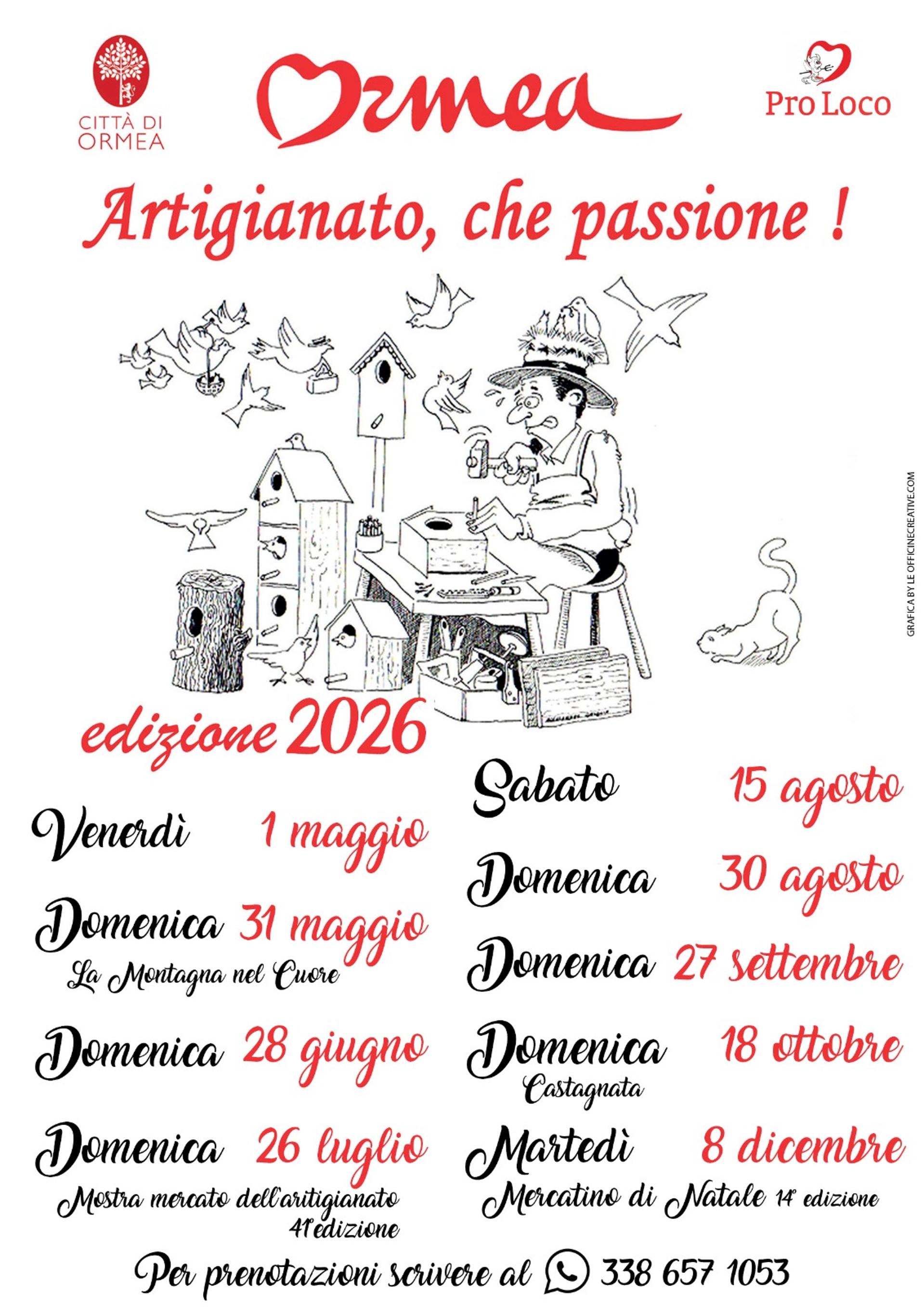 MERCATINI Periodo: 31/05/2026 Nel cuore del centro storico di Ormea, tornano i Mercatini del Cuore dalle 9.00 alle 19.00. Data: Domenica 31 maggio Per partecipare scrivere a +39 338 657 1053 . Informazioni Pro Loco Ormeaproloco.ormea@tiscali.it